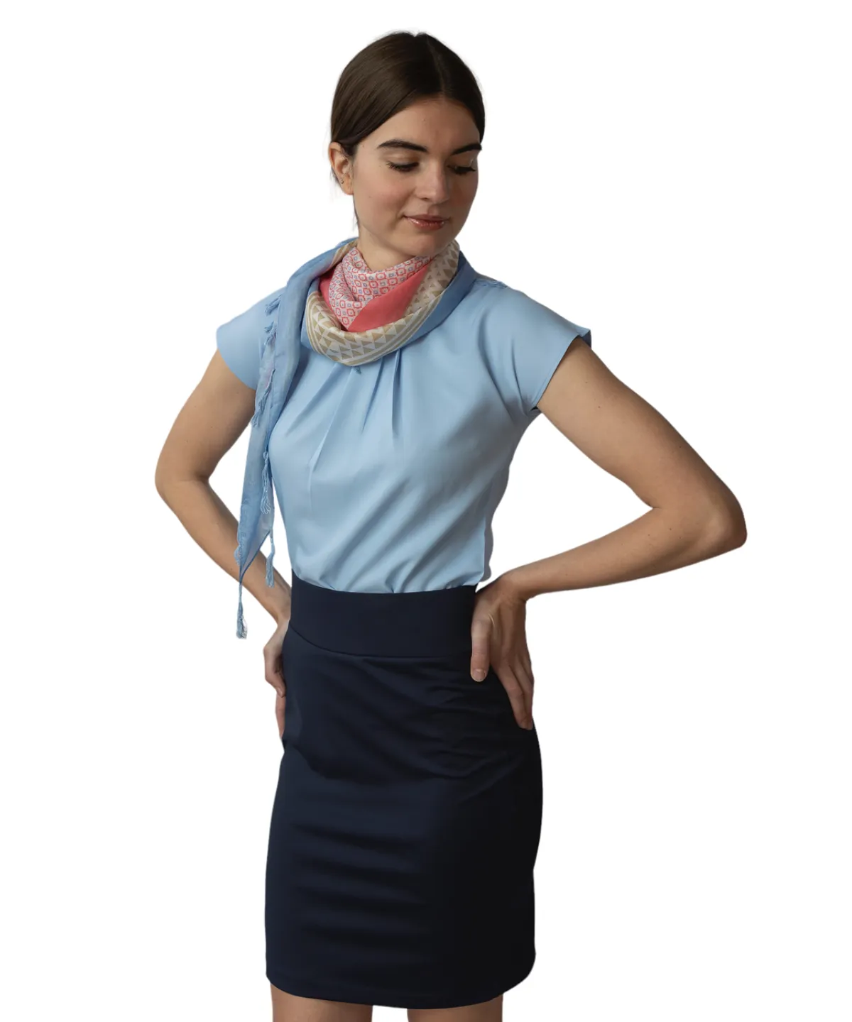 Introducing our super stretch pencil skirt, designed for yacht crew members who need both comfort and style. This stretch pencil skirt provides a perfect blend of professional appearance and ease of movement. The elasticated high waistband sits perfectly at your waist, accentuating your curves while allowing full flexibility for every task. Whether you’re in the black stretch pencil skirt or the elegant navy stretch pencil skirt, this skirt is made from stretchy fabric that moves with you—ideal for climbing stairs or staying active on deck. It’s also available in a range of sizes, making it a versatile choice for yacht uniforms.